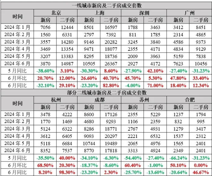 表1 一線及部分二線城市新房及二手房成交套數(shù)