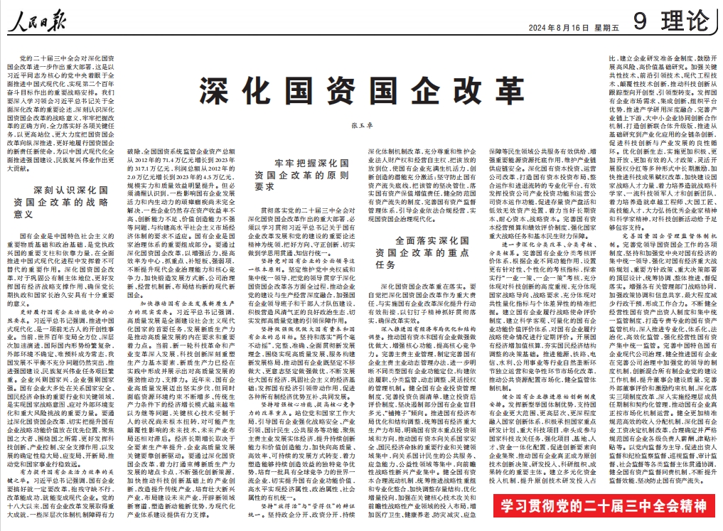 黨的二十屆三中全會(huì)對(duì)深化國(guó)資國(guó)企改革進(jìn)一步作出重大部署,這是以習(xí)近平同志為核心的黨中央著眼于全面推進(jìn)中國(guó)式現(xiàn)代化、實(shí)現(xiàn)第二個(gè)百年奮斗目標(biāo)作出的重要戰(zhàn)略安排。我們要深入學(xué)習(xí)領(lǐng)會(huì)習(xí)近平總書記關(guān)于全面深化改革的重要論述,深刻認(rèn)識(shí)深化國(guó)資國(guó)企改革的戰(zhàn)略意義,牢牢把握改革的正確方向,全力落實(shí)好各項(xiàng)關(guān)鍵任務(wù),以更高站位、更大力度把國(guó)資國(guó)企改革向縱深推進(jìn),更好地履行國(guó)資國(guó)企的新責(zé)任新使命,為以中國(guó)式現(xiàn)代化全面推進(jìn)強(qiáng)國(guó)建設(shè)、民族復(fù)興偉業(yè)作出更大貢獻(xiàn)。 深刻認(rèn)識(shí)深化國(guó)資國(guó)企改革的戰(zhàn)略意義 國(guó)有企業(yè)是中國(guó)特色社會(huì)主義的重要物質(zhì)基礎(chǔ)和政治基礎(chǔ),是黨執(zhí)政興國(guó)的重要支柱和依靠力量,在全面推進(jìn)中國(guó)式現(xiàn)代化進(jìn)程中發(fā)揮著不可替代的重要作用。深化國(guó)資國(guó)企改革,對(duì)于鞏固公有制主體地位、更好發(fā)揮國(guó)有經(jīng)濟(jì)戰(zhàn)略支撐作用、確保黨長(zhǎng)期執(zhí)政和國(guó)家長(zhǎng)治久安具有十分重要的意義。 更好履行國(guó)有企業(yè)功能使命的必然要求。習(xí)近平總書記強(qiáng)調(diào),推進(jìn)中國(guó)式現(xiàn)代化,是一項(xiàng)前無古人的開創(chuàng)性事業(yè)。當(dāng)前,世界百年變局全方位、深層次加速演進(jìn),國(guó)際國(guó)內(nèi)形勢(shì)紛繁復(fù)雜,外部環(huán)境不確定、難預(yù)料成為常態(tài),我國(guó)發(fā)展不平衡不充分問題仍然突出,推進(jìn)強(qiáng)國(guó)建設(shè)、民族復(fù)興偉業(yè)任務(wù)艱巨繁重。企業(yè)興則國(guó)家興,企業(yè)強(qiáng)則國(guó)家強(qiáng)。國(guó)有企業(yè)大多處在關(guān)系國(guó)家安全、國(guó)民經(jīng)濟(jì)命脈的重要行業(yè)和關(guān)鍵領(lǐng)域,是實(shí)現(xiàn)國(guó)家戰(zhàn)略意圖、應(yīng)對(duì)外部環(huán)境變化和重大風(fēng)險(xiǎn)挑戰(zhàn)的重要力量。要通過深化國(guó)資國(guó)企改革,切實(shí)把提升國(guó)有企業(yè)戰(zhàn)略功能價(jià)值放在優(yōu)先位置,聚焦國(guó)之大者、圍繞國(guó)之所需,更好發(fā)揮科技創(chuàng)新、產(chǎn)業(yè)控制、安全支撐作用,以發(fā)展的確定性穩(wěn)大局、應(yīng)變局、開新局,推動(dòng)黨和國(guó)家事業(yè)行穩(wěn)致遠(yuǎn)。 有力提升國(guó)有企業(yè)活力效率的關(guān)鍵之舉。習(xí)近平總書記強(qiáng)調(diào),國(guó)有企業(yè)要搞好就一定要改革,抱殘守缺不行,改革能成功,就能變成現(xiàn)代企業(yè)。黨的十八大以來,國(guó)有企業(yè)改革發(fā)展取得重大成就,一些深層次體制機(jī)制障礙有力破除,全國(guó)國(guó)資系統(tǒng)監(jiān)管企業(yè)資產(chǎn)總額從2012年的71.4萬億元增長(zhǎng)到2023年的317.1萬億元,利潤(rùn)總額從2012年的2.0萬億元增長(zhǎng)到2023年的4.5萬億元,規(guī)模實(shí)力和質(zhì)量效益明顯提升。但必須清醒認(rèn)識(shí)到,一些影響國(guó)有企業(yè)發(fā)展活力和內(nèi)生動(dòng)力的頑瘴痼疾尚未完全解決,一些企業(yè)仍然存在資產(chǎn)收益率不高、創(chuàng)新能力不足、價(jià)值創(chuàng)造能力不強(qiáng)等問題,與構(gòu)建高水平社會(huì)主義市場(chǎng)經(jīng)濟(jì)體制的要求不適應(yīng)。國(guó)有企業(yè)是國(guó)家治理體系的重要組成部分。要通過深化國(guó)資國(guó)企改革,以增強(qiáng)活力、提高效率為中心,抓重點(diǎn)、補(bǔ)短板、強(qiáng)弱項(xiàng),不斷提升現(xiàn)代企業(yè)治理能力和核心競(jìng)爭(zhēng)力,加快鍛造發(fā)展方式新、公司治理新、經(jīng)營(yíng)機(jī)制新、布局結(jié)構(gòu)新的現(xiàn)代新國(guó)企。 加快推動(dòng)國(guó)有企業(yè)發(fā)展新質(zhì)生產(chǎn)力的現(xiàn)實(shí)需要。習(xí)近平總書記強(qiáng)調(diào),高質(zhì)量發(fā)展是全面建設(shè)社會(huì)主義現(xiàn)代化國(guó)家的首要任務(wù),發(fā)展新質(zhì)生產(chǎn)力是推動(dòng)高質(zhì)量發(fā)展的內(nèi)在要求和重要著力點(diǎn)。當(dāng)前,新一輪科技革命和產(chǎn)業(yè)變革深入發(fā)展,科技創(chuàng)新深刻重塑生產(chǎn)力基本要素,新質(zhì)生產(chǎn)力已經(jīng)在實(shí)踐中形成并展示出對(duì)高質(zhì)量發(fā)展的強(qiáng)勁推動(dòng)力、支撐力。近年來,國(guó)有企業(yè)高質(zhì)量發(fā)展邁出堅(jiān)實(shí)步伐,但同時(shí)面臨資源環(huán)境約束不斷增多、傳統(tǒng)生產(chǎn)力條件下的經(jīng)濟(jì)增長(zhǎng)模式越來越難以為繼等問題,關(guān)鍵核心技術(shù)受制于人的狀況尚未根本扭轉(zhuǎn),對(duì)可能產(chǎn)生顛覆性影響的未來技術(shù)、未來產(chǎn)業(yè)布局還相對(duì)滯后。經(jīng)濟(jì)長(zhǎng)期增長(zhǎng)取決于全要素生產(chǎn)率提升,企業(yè)高質(zhì)量發(fā)展關(guān)鍵要靠創(chuàng)新驅(qū)動(dòng)。要通過深化國(guó)資國(guó)企改革,著力打通束縛新質(zhì)生產(chǎn)力發(fā)展的堵點(diǎn)卡點(diǎn),不斷強(qiáng)化創(chuàng)新策源,