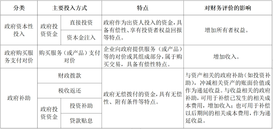 按照政府宏觀調(diào)控需要以及投資項目的項目性質(zhì)、運營模式和盈利能力,政府性資金主要包括政府資本性投入、政府購買服務(wù)支付對價和政府補助等類型。