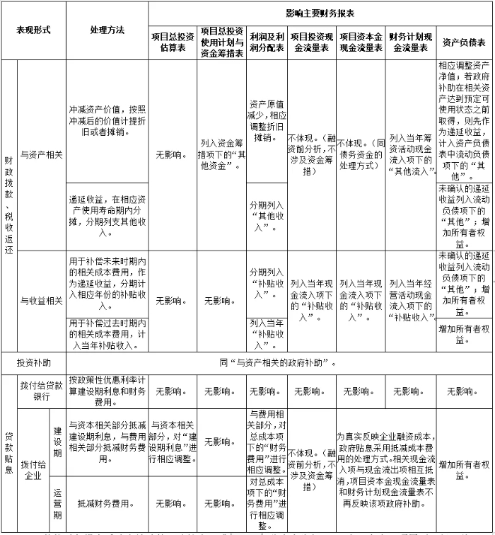 在投資項目財務(wù)評價中,政府補助分為與資產(chǎn)相關(guān)的政府補助和與收益相關(guān)的政府補助。項目前期階段財務(wù)評價實務(wù)中可將政府對投資項目在建設(shè)期的補助資金作為與資產(chǎn)相關(guān)的政府補助處理,在運營期的補助資金作為與收益相關(guān)的政府補助處理。