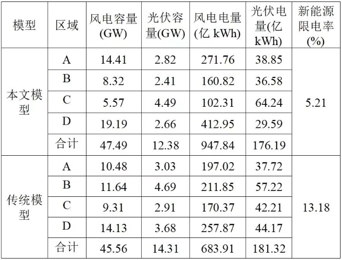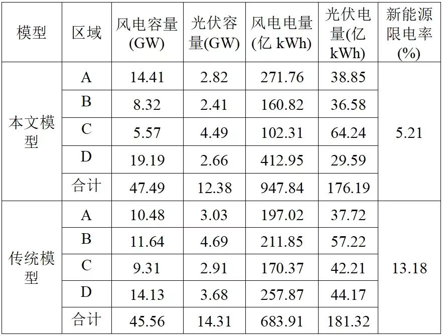 可以看出,對(duì)比傳統(tǒng)方法,考慮源-荷匹配后,本文模型所得D地區(qū)風(fēng)電和C地區(qū)光伏最優(yōu)布局容量分別增長(zhǎng)了35.81%和54.3%。從風(fēng)電和光伏總裝機(jī)方面看,本文模型所得風(fēng)電總?cè)萘枯^傳統(tǒng)方法高4.24%,這表明考慮源-荷匹配后,系統(tǒng)更傾向于配置互補(bǔ)性更好的風(fēng)電,光伏由于出力形狀較為固定,容量越大越難以實(shí)現(xiàn)源-荷匹配。此外,在新能源總裝機(jī)一致的情況下,本文模型得到的新能源年度總出力電量為1124.03億kWh,而傳統(tǒng)模型所得新能源年度總出力電量為865.23億kWh,前者相較后者提升29.91%,即考慮源-荷匹配可使新能源滲透率從28.51%增加至37.04%。從新能源限電方面看,考慮源-荷匹配可使新能源總限電率從傳統(tǒng)模型的23.18%降低至本文模型的5.21%??梢钥闯?,在同樣的裝機(jī)總?cè)萘肯拢紤]源-荷匹配可以充分提升新能源消納能力,減少棄風(fēng)、棄光情況。