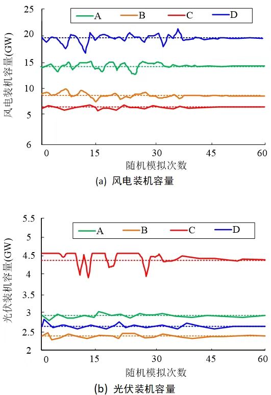 圖8中虛線為各指標(biāo)期望值,可以看出,各地區(qū)風(fēng)電裝機(jī)容量波動(dòng)范圍分別為14.1-14.9GW、7.9-8.7GW、5.2-5.8GW、17.3-20.8GW,光伏裝機(jī)容量波動(dòng)范圍分別為2.6-3GW、2.3-2.5GW、3.9-4.6GW、2.5-2.8GW??梢钥闯觯瑔未我?guī)劃結(jié)果具有一定隨機(jī)性,多組規(guī)劃結(jié)果期望值可靠性更高,所得規(guī)劃結(jié)果在60組場(chǎng)景下均收斂于期望值。