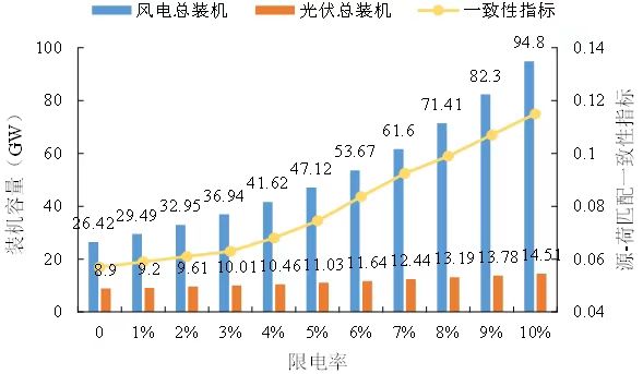 為了研究新能源限電率對(duì)多區(qū)域新能源優(yōu)化規(guī)劃布局和源-荷匹配效果的影響,本節(jié)給定CSP電站發(fā)電容量為3.35GW、系統(tǒng)最大新能源限電率由0增加至10%時(shí),計(jì)算風(fēng)、光最優(yōu)接入容量和源-荷匹配一致性指標(biāo)的情況,結(jié)果如圖6所示。