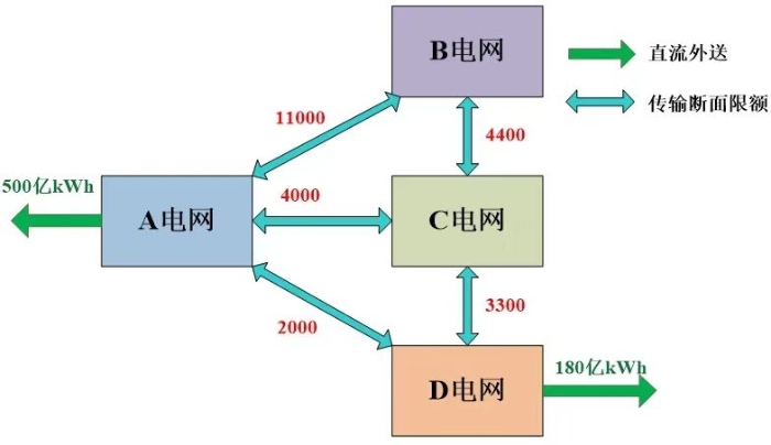 為驗(yàn)證所提計(jì)及源-荷匹配的新能源優(yōu)化布局方法的正確性,本節(jié)以我國(guó)北方某相鄰四個(gè)(省級(jí))地區(qū)電網(wǎng)為測(cè)試系統(tǒng),研究2030年的新能源規(guī)劃布局問題。四個(gè)地區(qū)分布于總面積125萬(wàn)平方公里范圍內(nèi),新能源滲透率達(dá)到30%以上。電網(wǎng)結(jié)構(gòu)圖如圖3所示,A、C電網(wǎng)均分別與其他電網(wǎng)相連,圖中紅色數(shù)字表示各區(qū)域間聯(lián)絡(luò)線限值(單位:MW),綠色數(shù)字為直流外送年電量(單位:億kWh)。算例計(jì)算步長(zhǎng)為1小時(shí),源-荷匹配周期設(shè)為1天,即24h。計(jì)算時(shí)段數(shù)8760h,其余主要算例參數(shù)見表1。本文中規(guī)劃水平年的風(fēng)電、光伏序列是基于該地區(qū)歷史出力序列進(jìn)行新能源出力場(chǎng)景生成得到的,負(fù)荷序列是立足這些地區(qū)2021年的實(shí)際負(fù)荷需求序列,假設(shè)負(fù)荷年增長(zhǎng)率為5%估計(jì)得到的。