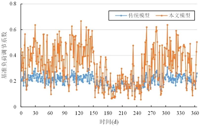 圖4顯示的是求解兩種模型所得的年度基準(zhǔn)負(fù)荷調(diào)節(jié)系數(shù),該參數(shù)描述的是每個(gè)匹配周期內(nèi)新能源總出力占基準(zhǔn)負(fù)荷的比例,其數(shù)值越高,說明新能源出力在系統(tǒng)總出力中占比越高。可以看出,本文模型中年度基準(zhǔn)負(fù)荷調(diào)節(jié)系數(shù)變化范圍為0-0.7,平均值為0.32;傳統(tǒng)模型的年度基準(zhǔn)負(fù)荷調(diào)節(jié)系數(shù)變化范圍為0.1-0.3,平均值為0.2。本文模型所得基準(zhǔn)負(fù)荷調(diào)節(jié)系數(shù)更高,有利于提升新能源消納水平。