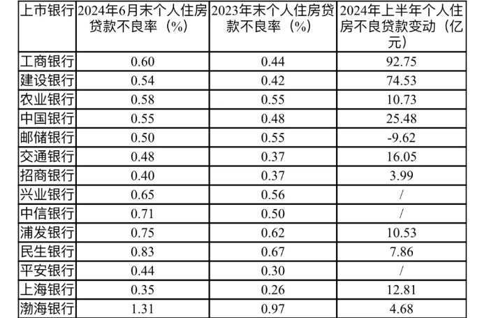 個人房貸此前一直是銀行的優(yōu)質資產(chǎn),但今年以來,受房地產(chǎn)銷售低迷、經(jīng)濟增長放緩等因素影響,大中型銀行的個人住房貸款不良率幾乎全部較上年末有所上升。工行、建行、農行、中行和交行2024年上半年個人住房貸款不良率分別上升了0.16、0.12、0.03、0.07和0.11個百分點。截至6月末,工行的個人住房貸款不良率最高,為0.60%,國有大行只有郵儲銀行實現(xiàn)了個人住房貸款不良“雙降”。披露個人住房貸款資產(chǎn)質量的7家股份制銀行(招行、興業(yè)、中信、浦發(fā)、民生、平安、渤海),個人住房貸款不良率全線走高,其中,渤海銀行的個人住房和商業(yè)用房貸款不良率達到了1.31%。不良貸款的增加會侵蝕銀行資產(chǎn)質量,加重經(jīng)營成本,削弱風險管控能力,進而影響銀行整體財務穩(wěn)定性。