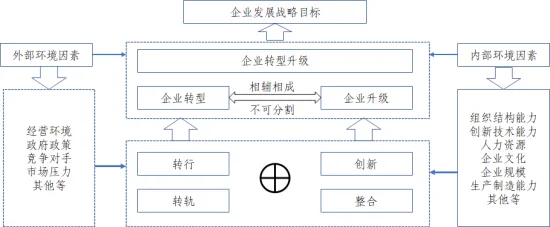 企業(yè)轉(zhuǎn)型升級在宏觀層面表現(xiàn)為主導產(chǎn)業(yè)更替、增長動力轉(zhuǎn)換、從低附加值產(chǎn)業(yè)向高附加值產(chǎn)業(yè)轉(zhuǎn)換等結(jié)構(gòu)性改變,在微觀層面表現(xiàn)為技術(shù)水平、生產(chǎn)效率、管理能力和產(chǎn)品附加值等的全面提升。企業(yè)轉(zhuǎn)型,是企業(yè)為更好應(yīng)對內(nèi)外部環(huán)境變化,在關(guān)鍵技術(shù)、工藝流程、管理模式、業(yè)務(wù)結(jié)構(gòu)、營銷渠道等方面所采取的根本性變革,由一種狀態(tài)向另一種狀態(tài)的轉(zhuǎn)變,包括轉(zhuǎn)行和轉(zhuǎn)軌,前者表現(xiàn)為企業(yè)在不同產(chǎn)業(yè)之間的轉(zhuǎn)換,后者表現(xiàn)為不同發(fā)展模式之間的轉(zhuǎn)變,最終目的在于提質(zhì)增效[1][2]。其中,轉(zhuǎn)行主要聚焦于“重點做什么”的問題,即企業(yè)敏銳辨別發(fā)展環(huán)境的變化,及時識別機會與威脅,進入新產(chǎn)業(yè)領(lǐng)域或創(chuàng)造新市場的過程。主要模式包括:轉(zhuǎn)向新行業(yè),但仍保留原行業(yè);完全退出原行業(yè),進入新行業(yè);在原行業(yè)中沿產(chǎn)業(yè)鏈向上、下游環(huán)節(jié)延伸。轉(zhuǎn)軌重點關(guān)注“如何做”的問題,是指企業(yè)仍專注原核心業(yè)務(wù),通過對管理體系與組織功能單元的提升,實現(xiàn)綜合能力的整體躍遷,主要涉及企業(yè)類型、商業(yè)模式、進入新市場等內(nèi)容。企業(yè)升級,是指推動產(chǎn)業(yè)轉(zhuǎn)型與核心業(yè)務(wù)能力的協(xié)同提升,進而實現(xiàn)企業(yè)在產(chǎn)業(yè)鏈上的升級。企業(yè)升級一般通過創(chuàng)新和整合(企業(yè)兼并重組)來實現(xiàn),包括工藝(流程)升級、產(chǎn)品升級、功能升級、價值鏈條升級和從OEM(貼牌生產(chǎn))—ODM(自主設(shè)計生產(chǎn))—OBM(自主品牌生產(chǎn))等升級方式[3]。流程升級就是工藝的改造、新技術(shù)的引進,產(chǎn)品升級就是從低端產(chǎn)品提升到高端產(chǎn)品,功能升級是指企業(yè)從當前所處產(chǎn)業(yè)鏈的環(huán)節(jié)向兩端延伸,產(chǎn)業(yè)鏈升級是企業(yè)突破了原來的產(chǎn)業(yè)鏈條,轉(zhuǎn)到一個新的產(chǎn)業(yè)鏈上。同時,還有混合轉(zhuǎn)型升級策略,即企業(yè)既開展深度的“轉(zhuǎn)行”策略,同時也采取漸進式的“轉(zhuǎn)軌”與“升級”策略。