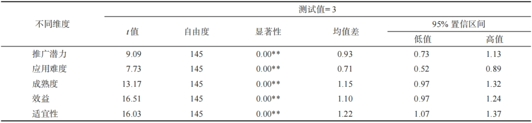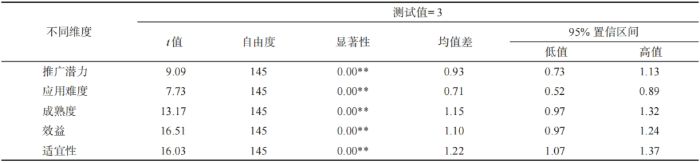 基于SPSS統(tǒng)計軟件,采用t檢驗方法對146份問卷及其5個維度進(jìn)行檢驗分析,以判斷調(diào)查結(jié)果是否符合統(tǒng)計檢驗標(biāo)準(zhǔn)。t檢驗公式如下: