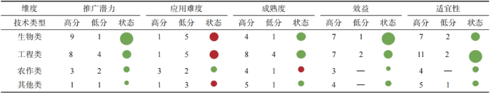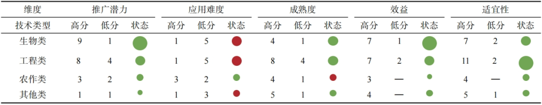為了便于評價不同技術(shù)類型的效果,將技術(shù)劃分為生物類、工程類、農(nóng)作類和其他類技術(shù)四個類型[39,40]。技術(shù)的評價指標(biāo)包括技術(shù)推廣潛力、應(yīng)用難度、成熟度、效益、適宜性五個方面[16,39]。其中,推廣潛力指在未來發(fā)展過程中該項技術(shù)持續(xù)使用的優(yōu)勢;應(yīng)用難度指技術(shù)應(yīng)用過程中對使用者技能素質(zhì)的要求及技術(shù)應(yīng)用的成本;成熟度指對技術(shù)體系完整性、穩(wěn)定性和先進(jìn)性的度量;效益指技術(shù)實施后對生態(tài)、經(jīng)濟(jì)和社會帶來的促進(jìn)作用;適宜性指技術(shù)與實施區(qū)域發(fā)展目標(biāo)、立地條件、經(jīng)濟(jì)需求、政策法律配套的一致程度。