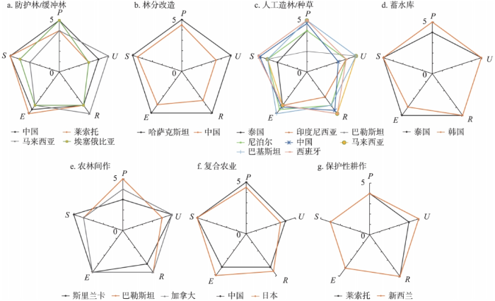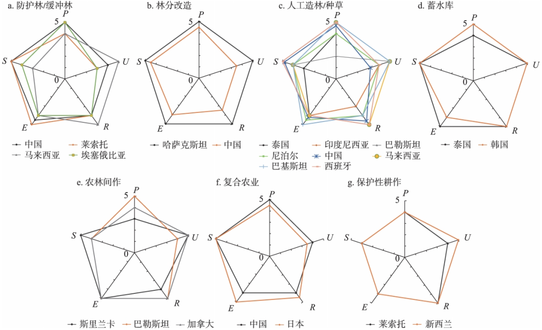 為進(jìn)一步對比相同技術(shù)在不同國家水土流失治理中的效果,以綜合指數(shù)>0.85且至少在兩個國家應(yīng)用為依據(jù),篩選出防護(hù)林/緩沖林(生物)、林分改造(生物)、人工造林/種草(生物)、蓄水庫(工程)、農(nóng)林間作(農(nóng)作)、復(fù)合農(nóng)業(yè)(農(nóng)作)、保護(hù)性耕作(農(nóng)作)7項關(guān)鍵技術(shù),對其效果進(jìn)行分析。