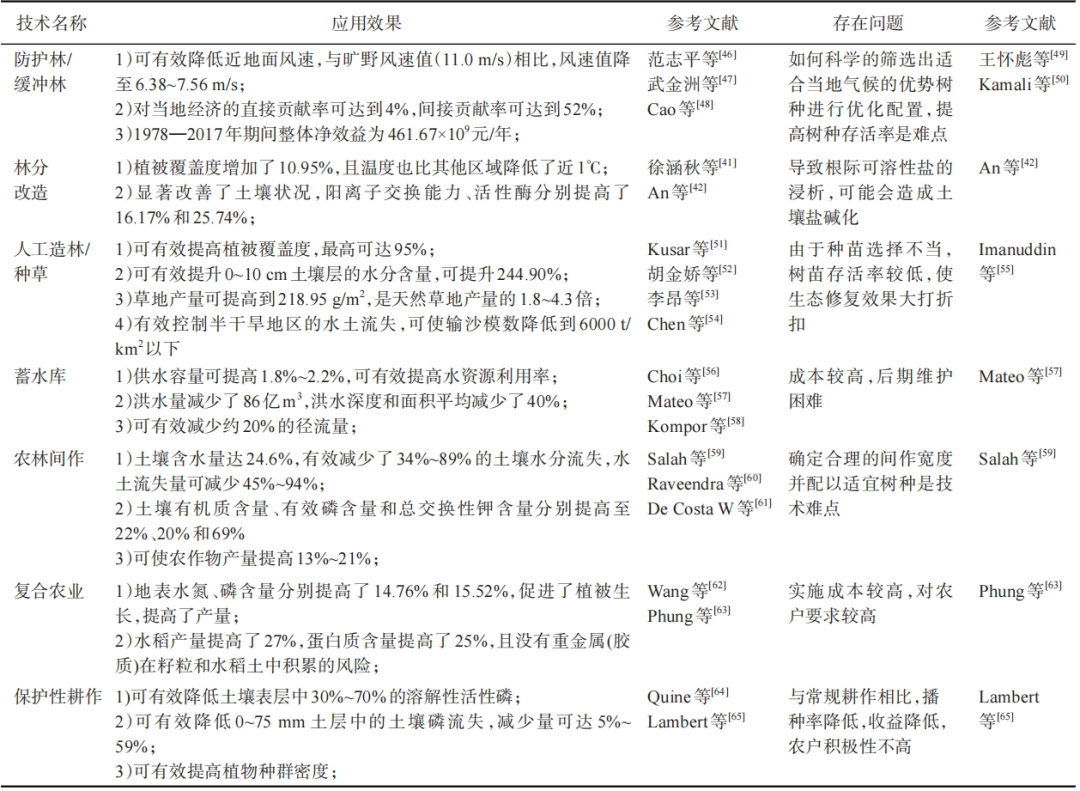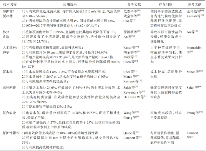 全球各個國家通過實施一系列生態(tài)治理工程,已有22.8%的生態(tài)退化區(qū)實現(xiàn)了生態(tài)系統(tǒng)好轉(zhuǎn)[34]。世界水土保持方法和技術(shù)縱覽合作組織(WOCAT)總結(jié)了49項中國水土流失治理技術(shù)[69],Wang等[19]也發(fā)現(xiàn)目前已有101項技術(shù)應(yīng)用到了全球水土流失、荒漠化和退化生態(tài)系統(tǒng)的治理中,本文梳理出45項水土流失治理技術(shù),涵蓋生物類、工程類、農(nóng)作類和其他類4種類型,已有研究歸納總結(jié)的水土流失治理技術(shù)可為技術(shù)遴選提供有力支撐[19,35,69]。但在一些國家和地區(qū)仍缺少適當(dāng)?shù)募夹g(shù)和模式進(jìn)行生態(tài)治理和修復(fù)[42,55,63],如何選擇并應(yīng)用治理綜合效果好的技術(shù),仍是一項具有挑戰(zhàn)性的工作。例如土壤結(jié)皮技術(shù)通過提高土壤肥力可有效減少水土流失,目前在小規(guī)模的室內(nèi)和野外培養(yǎng)中取得了較好的治理效果[70],但其成本太高,因此在大范圍推廣時需開展投入-產(chǎn)出分析判斷成本與效益的關(guān)系,因此在水土流失面積范圍較大的脆弱區(qū)采用該技術(shù)時應(yīng)充分考慮成本和效益的關(guān)系[71]。盡管目前針對不同退化類型形成了基本的治理技術(shù)和模式,但在實際治理過程中仍出現(xiàn)了部分失敗或治理效果欠佳的生態(tài)治理案例[42,50,72],例如在高寒草甸地區(qū)種樹不僅導(dǎo)致樹種死亡,還破壞了草地資源和畜牧業(yè)[72];大規(guī)模的造林可能會使植被蒸騰增加,消耗更多的水分,導(dǎo)致造林區(qū)域植被蓋度降低[73];樹種單一、層次簡單、結(jié)構(gòu)不穩(wěn)定等問題,造成樹苗死亡率高和耗費(fèi)水資源量大等,導(dǎo)致治理效果大幅降低[74]