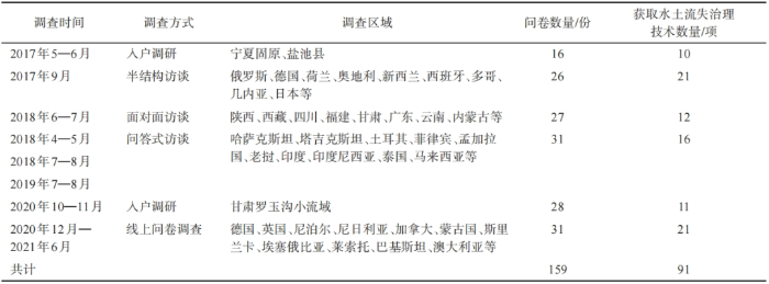 針對上述66個案例區(qū),采取面對面和線上問卷方式,對國內(nèi)、外相關(guān)專家進(jìn)行調(diào)查,獲取調(diào)研數(shù)據(jù)。問卷主體內(nèi)容包括退化區(qū)名稱、地理位置(包括自然條件、社會經(jīng)濟(jì)狀況)、水土流失退化驅(qū)動因子(包括自然、人為)、目前實施的水土流失治理技術(shù)名稱及應(yīng)用評價打分、應(yīng)用中存在的問題以及技術(shù)需求等;調(diào)查過程(見表1)具體描述如下:
