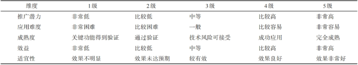 式中:δ為技術(shù)的綜合指數(shù);j為維度;SAj為第j個維度的實際技術(shù)評價分?jǐn)?shù);ωaj為第j個維度的實際權(quán)重,本文采用等權(quán)重法,均取1;ωpj為理想狀態(tài)下第j個維度的權(quán)重,采用等權(quán)重法,均取1;本文SPj為理想狀態(tài)下第j個維度的技術(shù)得分斜體,本文取滿分5分;綜合指數(shù)位于0~1之間,將綜合指數(shù)≥0.85的技術(shù)定義為高分技術(shù),≤0.65的技術(shù)定義為低分技術(shù)。為篩選優(yōu)良技術(shù),總結(jié)技術(shù)存在問題,僅分析高分和低分技術(shù),暫不考慮綜合指數(shù)位于(0.65,0.85)之間的技術(shù)。