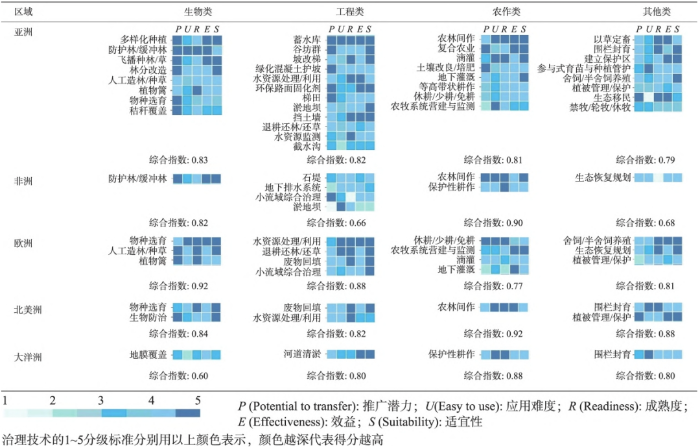 適宜的水土流失治理技術(shù)可有效減少土壤侵蝕,但其是否能夠成功應(yīng)用具有一定的挑戰(zhàn)性。許多技術(shù)的應(yīng)用在空間、時間以及實施方法等方面具有差異性[24],此外,同一區(qū)域應(yīng)用技術(shù)的實施條件及其對水土流失的治理效果也會隨著時間的推移發(fā)生變化,例如不同使用年限的淤地壩截留的泥沙量明顯不同[25]。迄今為止,已經(jīng)有大量文獻(xiàn)從國家尺度[26-28]、區(qū)域尺度[24,29]以及全球尺度[30-31]評價了水土流失治理技術(shù)的效果或影響。此外,也有大量文獻(xiàn)圍繞某一特定治理技術(shù)在一個國家或區(qū)域的發(fā)展歷程及其面臨的挑戰(zhàn)開展了深入研究,例如加拿大草原[32]和美國加州[33]土壤耕作技術(shù)的發(fā)展歷史及挑戰(zhàn),然而從全球視角對比分析不同區(qū)域水土流失治理技術(shù)特點與效果的研究還不夠深入,尚缺少水土流失治理技術(shù)成熟度、適宜性、推廣潛力和應(yīng)用難度等維度的研究;同時,由于自然條件、環(huán)境、制度等多種因素的復(fù)雜性,目前仍缺乏對區(qū)域技術(shù)的系統(tǒng)總結(jié)與區(qū)域間差異的刻畫,缺乏統(tǒng)一的度量體系對現(xiàn)有技術(shù)本身進(jìn)行評估,這在很大程度上限制了優(yōu)良技術(shù)的推廣和應(yīng)用。