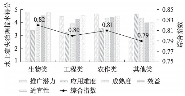 2.生物類水土流失治理技術(shù)的綜合指數(shù)最高為0.82,其次是農(nóng)作類水土流失治理技術(shù)(0.81)。工程類水土流失治理技術(shù)由于應(yīng)用難度較高、成熟度較低導(dǎo)致綜合指數(shù)略低。其他類水土流失治理技術(shù)推廣潛力較小、效益和適宜性較低,有待進(jìn)一步提高。