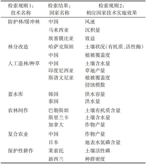 自2000年以來生態(tài)治理技術(shù)得到系統(tǒng)梳理[23],為了進(jìn)一步量化2000-2020年全球典型生態(tài)脆弱區(qū)水土流失治理技術(shù)數(shù)量及其應(yīng)用效應(yīng),對比分析相同技術(shù)在不同國家水土流失治理中的效果,本文基于WebofScience、GoogleScholar、Scopus和中國知網(wǎng)等在線數(shù)據(jù)庫進(jìn)行了文獻(xiàn)檢索,共檢索出26篇論文,包括人工造林/種草、蓄水庫、保護(hù)性耕作等7項關(guān)鍵技術(shù),覆蓋中國、日本、加拿大等14個國家。檢索規(guī)則和檢索關(guān)鍵詞見表2按照檢索規(guī)則1對技術(shù)名稱進(jìn)行檢索,在此基礎(chǔ)上,根據(jù)檢索規(guī)則2對66個案例區(qū)不同治理技術(shù)的實施效果進(jìn)行檢索。