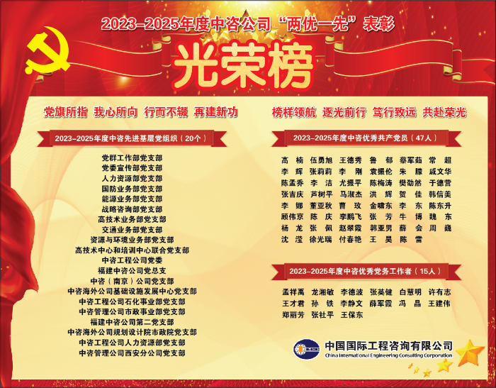 大會共表彰了20個“先進基層黨組織”、47名“優(yōu)秀共產(chǎn)黨員”和15名“優(yōu)秀黨務(wù)工作者”。公司領(lǐng)導為受表彰的先進集體和個人頒獎。能源業(yè)務(wù)部李德波、中咨工程公司牛博、中咨海外公司蘇寶健代表獲獎集體和個人作交流發(fā)言。